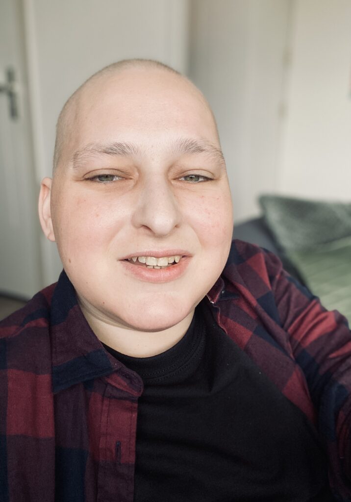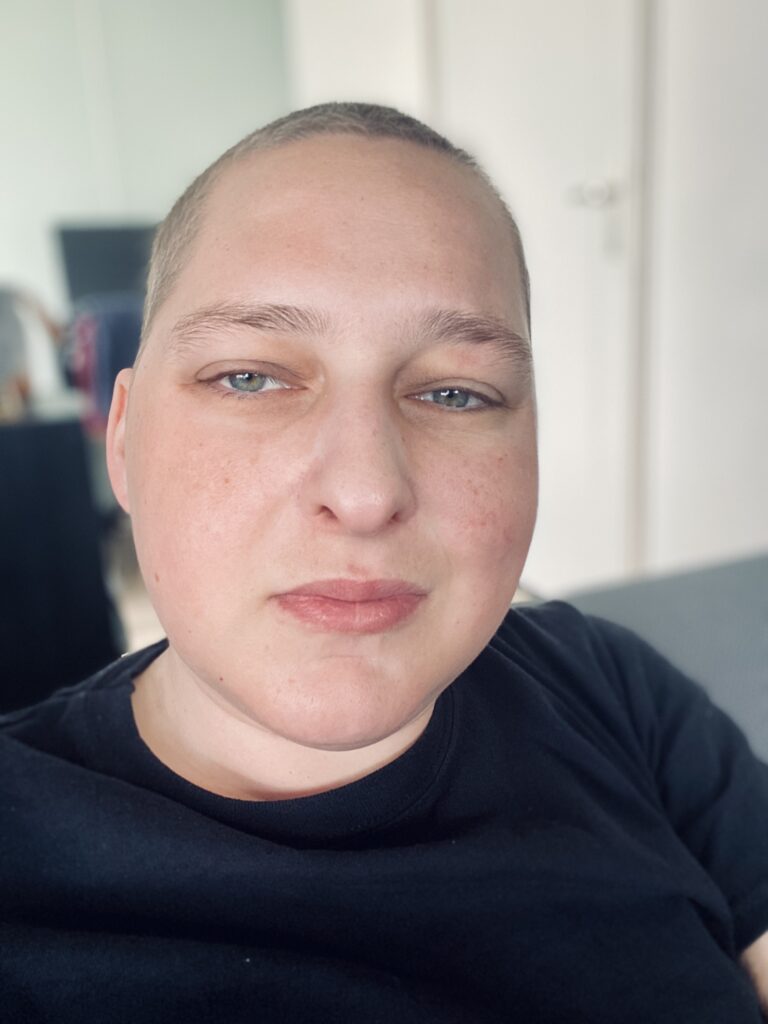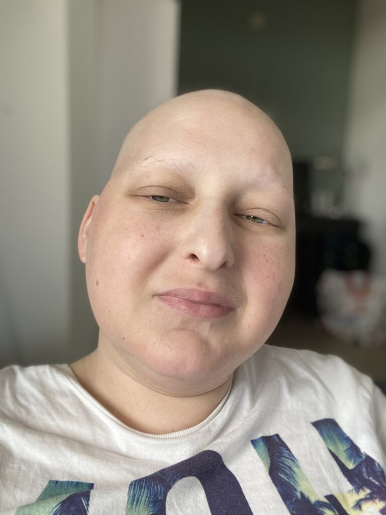 In de maanden daarna groeide mijn haar heel langzaam terug tot een paar centimeter, maar het voelde doods aan en was volledig wit. Net toen het echt begon te groeien, startte ik met de bestralingen en chemotherapie voorafgaand aan de stamceltransplantatie op 24 maart 2022. Dit keer verloor ik al mijn haar, inclusief wenkbrauwen en wimpers. Ik weet nog dat ik een verpleegkundige vroeg of het wel terug zou groeien. Blijkbaar maakte ik me er toch zorgen over. Ze stelde me gerust en zei dat dat meestal het geval was. Daardoor kon ik mijn nieuwe look makkelijker omarmen.